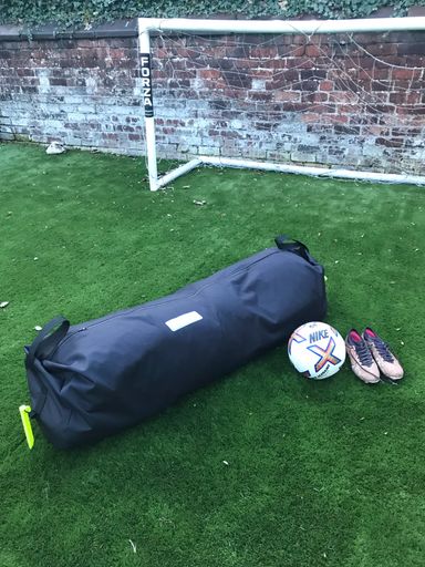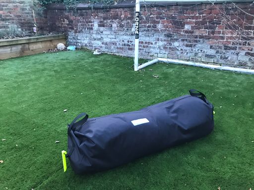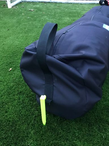 “Packable waterproof kit bag for players belongings in outdoor team sports. The bag has grab handles at both ends and plastic ground pegs on elasticated cord to tether the and in adverse weather conditions”